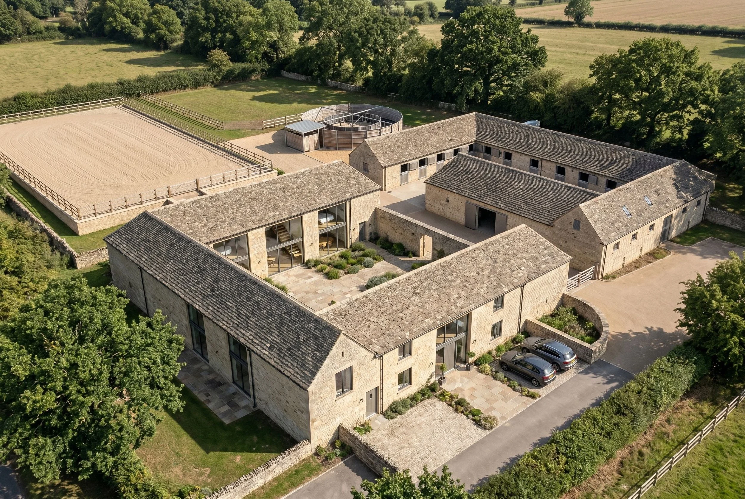 Set within the Gloucestershire countryside, this project showcases how traditional agricultural architecture can be sensitively transformed into a contemporary equestrian home. The collection of stone barns, once purely functional farm buildings, has been reimagined as a multigenerational residence where rural character, modern comfort and equestrian purpose come together seamlessly.